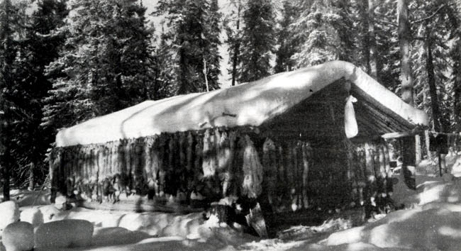 November, Monday 1st - Got up at 5 o'clock, took one look outside and crawled back into the feathers, it was snowing and everything was well covered already. It's been snowing a little all day and still is, have a good 4 inches now. I've just been real lazy, read a little (magazine digests) did a little fixing up in the camp, and a little bit of figuring towards a telescopic stove pipe and a lighter stove to pack around. I stayed in bed until the cows almost came home, 8:15. Hope the weather lets up enough so I can move on in the morning as this has been about the most miserably long day of them all, at this camp there is nothing but the bare essentials, the same as at Reedy, so there is nothing I can do to pass the time away when the weather is too nasty to be out. I now have about 188 snares and 60 traps, total 248. But in spite of the fact that snares out number traps 3 to 1, the traps have been bringing the most bacon due mostly to the ones in snares are usually the ones that are eaten. I lost (eaten out): snares 10, traps 1; the skins I have came: snares 10, traps 8, shot 1. Its too bad I haven't some larger traps. Changed into my heavy undies.