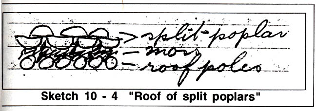 Thursday, 16th - This has been a rather pleasant day for a change. My meat got a good smoking, but the two sacks which I had hung to keep the breeze from blowing the smoke caught fire, I saved just half of one. This taking over someone elses' camp is the bunk, everything seems to need fixing. Fell off the roof with part of the roof poles, hurt my knee, then I noticed that the roof and gable ends were on the verge of collapsing, so had to put in a heavy brace after prying it over where it belonged and also had to put a prop under the ridge in the middle. Got two canoe loads of moss from the foot of the high rock, to put on the roof, need about two more loads to finish the roof, and have some for chinking. Am using fair-sized poplars, split thru the middle to cover the roof, like this: