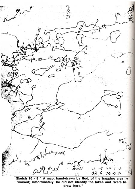Sketch 10-8 A map, hand-drwawn by Rod, of the trapping area he worked; unfortunately, he did not identify the lakes and rivers he drew here