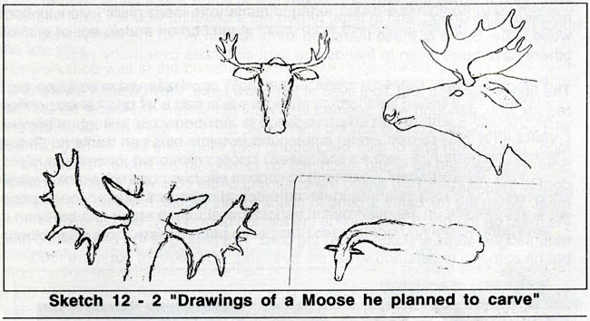 Rod carved the wild animals he had once trapped and shot for their fur and for their meat. He was completely conversant with the anatomy of beaver, fox, coyote, lynx, deer and moose (Picture 12 - 5) - he needed no lessons on body proportions, no suggestions that a leg should more correctly be aligned this way or that. He had worked with these animals so often, over so many years, it was second nature to him to know the shapeliness of the creatures he carved. They had been more than his quarry - they had been his livelihood, his companions - at times the only creatures he saw for days (Sketch 12 - 2).