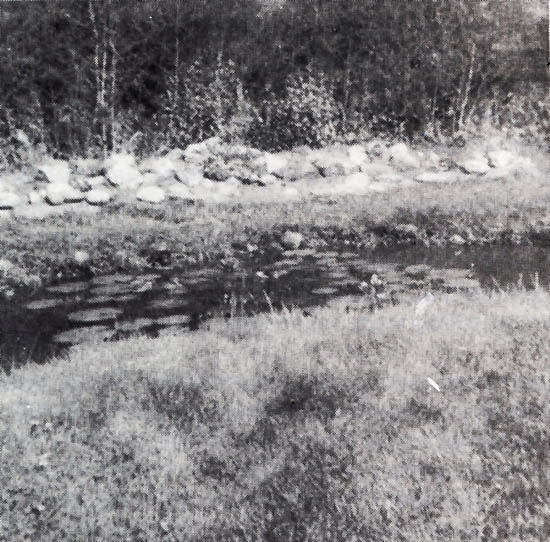 Once again, gardening and the local birds filled many of their hours. Rod built bird houses and feeders and befriended all the feathered creatures who visited their yard. Since open water was in short supply in their immediate area - Round Lake was some three miles distant, and the only open water for miles around- Rod decided to build another lily pool. They had found the one at Longbow Lake attracted many birds, not only to drink, but also to bathe and preen their freshly cleaned plumage. Starting at a low spot where the garden and orchard met, Rod cleaned an area for the pond, (Picture 13 - 1) and gathered and placed sizable rocks on which people, as well as birds, could rest and relax. The surrounding earth was planted with small shrubs and flowers, providing an attractive and tranquil setting for all who ventured there. Water lilies (Picture 13 - 2) floated on the surface of the water, and the blossoms of other flowers, as the seasons passed, were gracefully reflected in the clear water of the pool. In the summer the air was filled with birdsong, the busy buzzing of bees, the rustle of plants in the breezes.