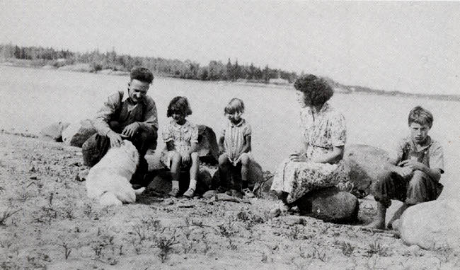 The Schuetze cabin at Berens River was small for five people, and in the heat of the summer, Toni found she needed to adjust her schedule of housework to allow for it. The sun shone directly on the house in the mornings, making it unbearably hot, so she and the children spent that part of the day out-of-doors. One bright, hot morning, Toni sat on rocks at the edge of the lake, busy sewing or knitting and watching the children at play nearby. The little girls, clad in sundresses, had games - real or imaginary, of their own. The morning passed and once the trees afforded the house some shade, Toni said to the girls: "Stay out of the water, I am going to the house now."