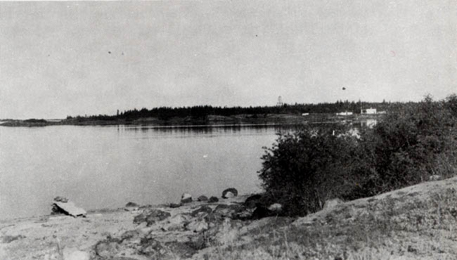 Picture 9-3 Looking across the bay at 'Starvation Point' - also in the view are the firetower where Rod watched for forest fires, and the Hudson's Bay post which was managed by Dan Patterson