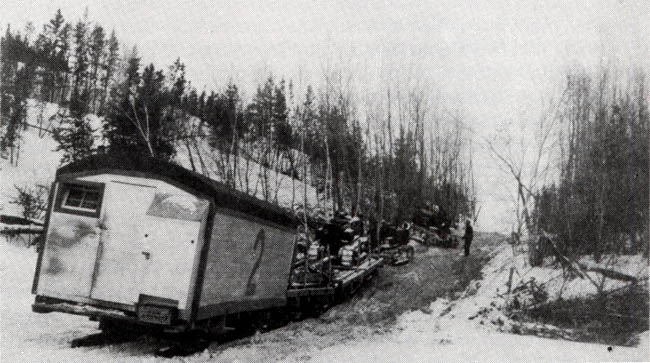 The cook managed the caboose that served as both cookshack and bunkhouse, keeping a constant supply of hot food and beverages for the men working in the cold. The caboose door (Picture 9 - 5) opened onto the trail they had just covered - one day the cook was standing in the doorway, a pot of hot potatoes in one hand, and holding onto the door with the other. The simplest way of draining the potatoes was out the back door - then he didn't have to make a trip to dispose of the cooking water. The train was moving over some very rough terrain at the time, and the cook waited, hoping the caboose would gain some smoother conditions. However, the steel runner instead struck a sharp jolt - the door fell off its hinges, and the cook found himself in a pile on the trail, potato pot in one hand, the caboose door in the other, watching the train slowly leaving him behind. Struggling to his feet, he tried to rush after the caboose, but being so encumbered with a heavy door, plus he could not desert his potatoes, now ready for their evening meal, he was at a serious disadvantage. Some of the crew saw him and rescued him, but there were many comments, and much laughter at the predicament he had been in.