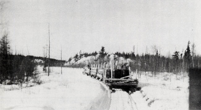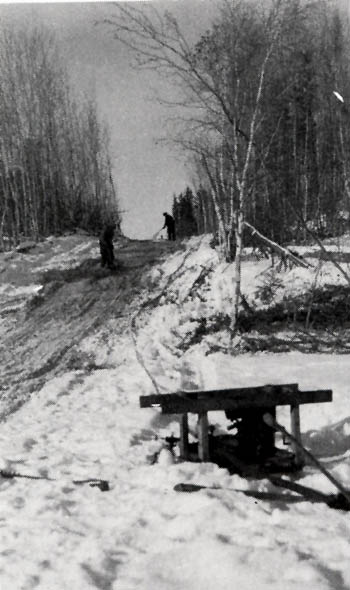 In January of 1940, Rod set out, for the first time, with the road crew to build the road to haul freight that winter. The distance from Berens River to Favourable Lake was about one hundred sixty miles across country - the road was a little longer, since the terrain was rugged, (Picture 9 - 4) with lakes, muskegs, rivers and hilly country to traverse. The work train consisted of two caterpillars, each towing several supply sleighs carrying fuel, dynamite and other equipment, along with food stuffs, plus a caboose which served as a cook shack, bunkhouse and general meeting quarters.