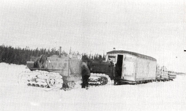 The building of the winter road was a difficult and sometimes dangerous task. No definite start-up date could be established, since the weather conditions influenced when the work could start. The ground needed to be well frozen before the crews took their heavy machinery out on muskegs and lakes. Members of the road building crew were brought in on the last ships' sailing of the season, and there they waited until the weather and their boss, Ernie Wright, said it was time to get on with the job.